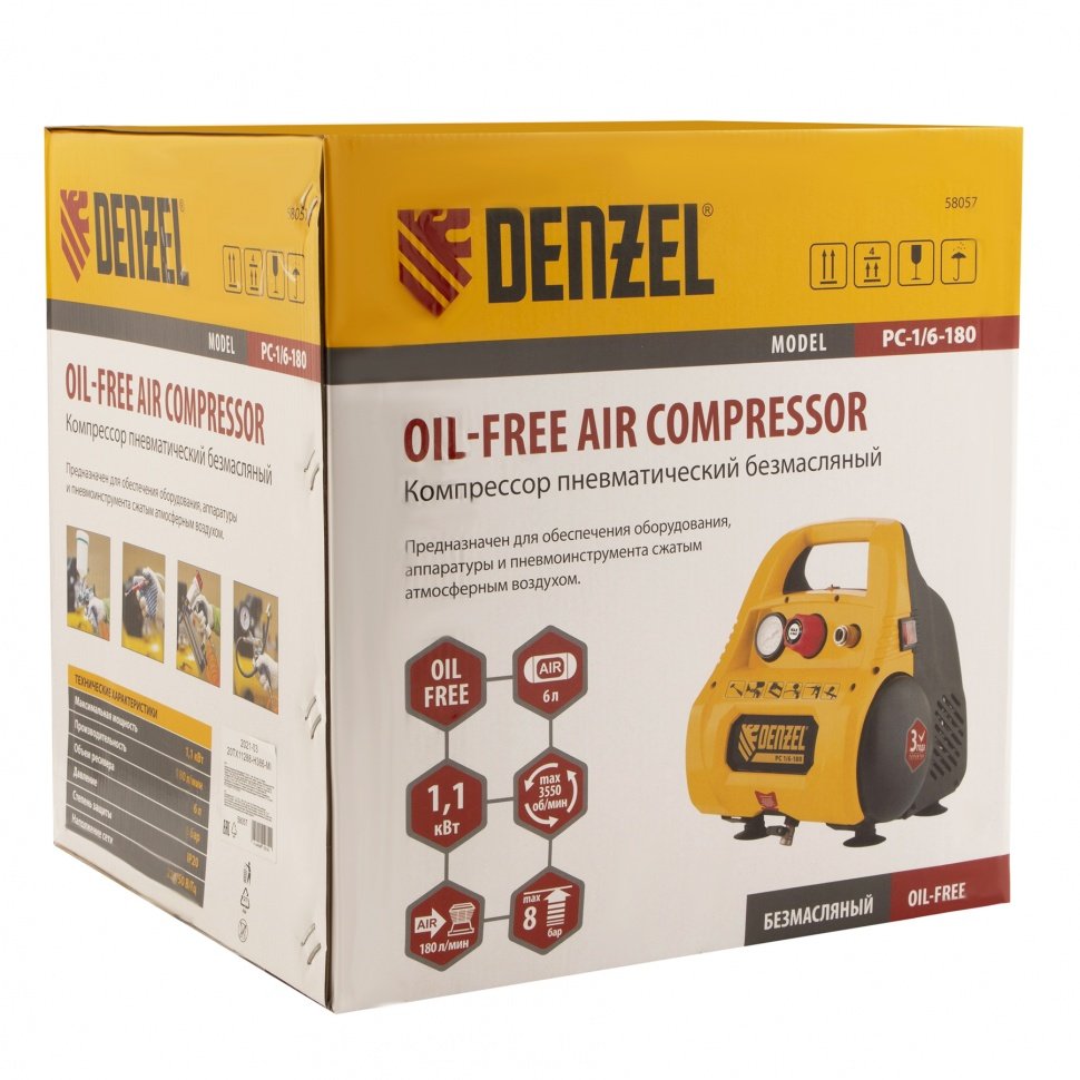Компрессор воздушный безмасляный РС 1/6-180, 1,1 кВт, 180 л/мин, 6 л// Denzel