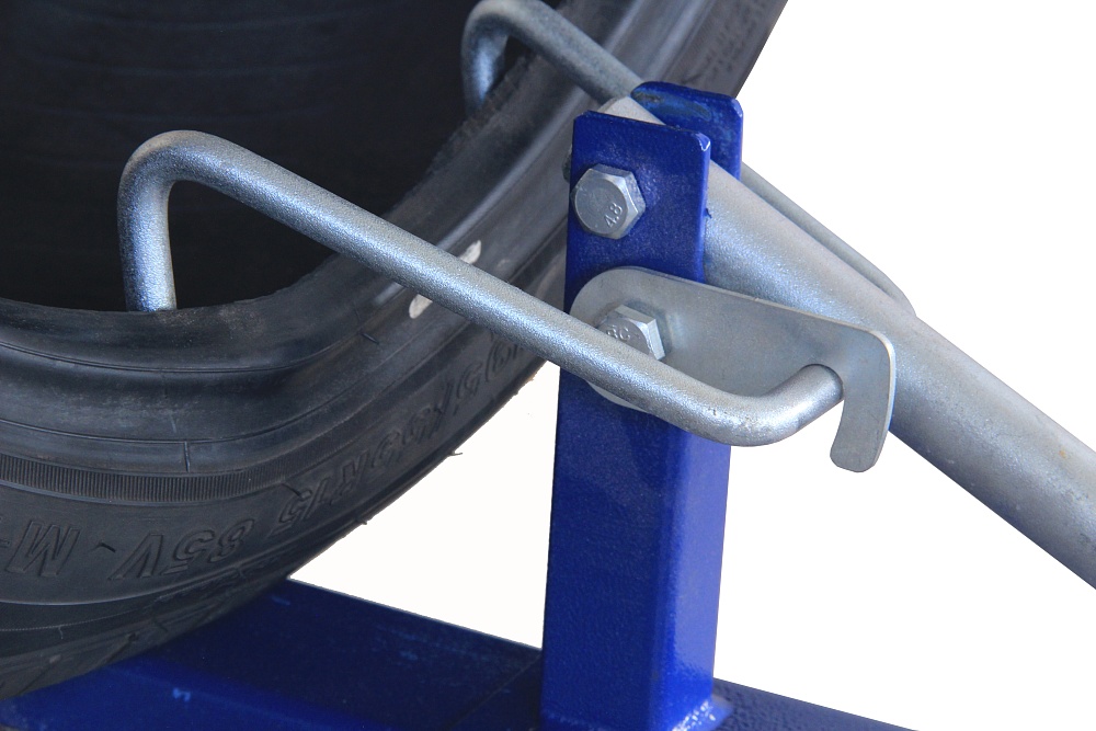 Прибор имеет простую конструкцию: это опорная планка с крюками-зажимами, которые устанавливаются на борта шины, а затем разводятся в стороны нажатием на рычаг. Один зажим может перемещаться по планке, позволяя устанавливать покрышки различной ширины, и закрепляется винтом.