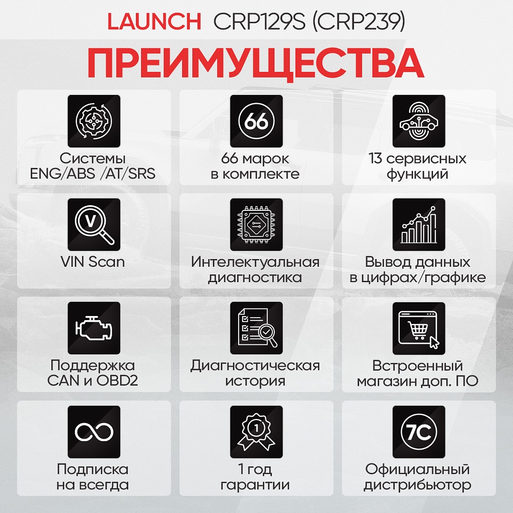 Launch CRP129S — это обновлённая версия портативного сканера Launch CRP239 на платформе Android. Теперь в комплект входят 13 сервисных функций, увеличенный аккумулятор ёмкостью до 6000 mAh и встроенная память объёмом до 32 GB. В остальном это тот же сканер, ориентированный на личное использование и небольшие СТО, с помощью которого вы сможете продиагностировать такие системы, как ENG, ABS, AT, SRS, а также провести диагностику по протоколу OBD-II.