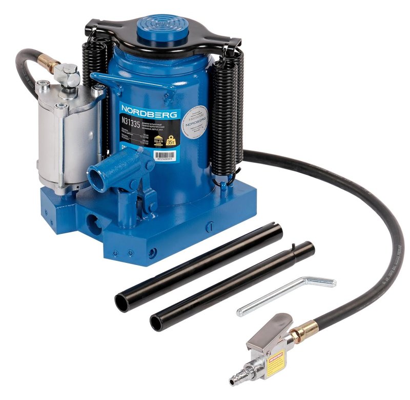 Домкрат бутылочный пневмогидравлические NORDBERG N31335 предназначенный для поднятия грузов при помощи ручного или пневматического привода. Бутылочный домкрат отличается компактностью конструкции, простотой обслуживания и надежностью в эксплуатации.  Он позволяет осуществлять плавный подъем груза при небольшом рабочем усилии благодаря высокому передаточному отношению между площадями поперечного сечения цилиндра и плунжера насоса. Широкое опорное основание позволяет использовать домкрат на любой поверхности, включая мягкий грунт.