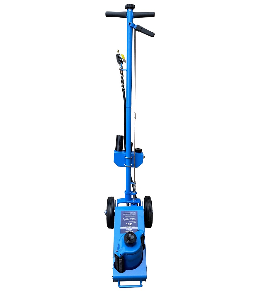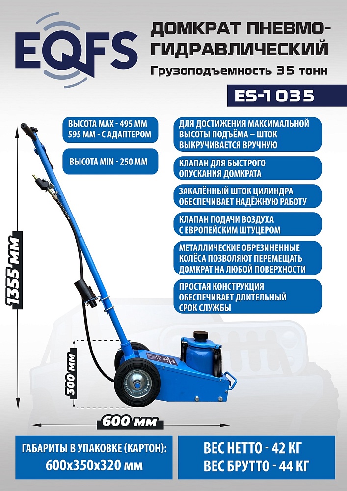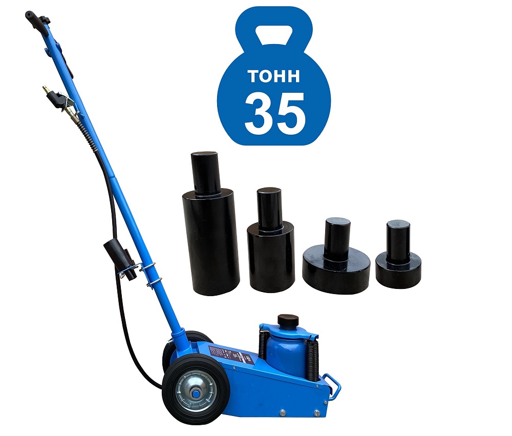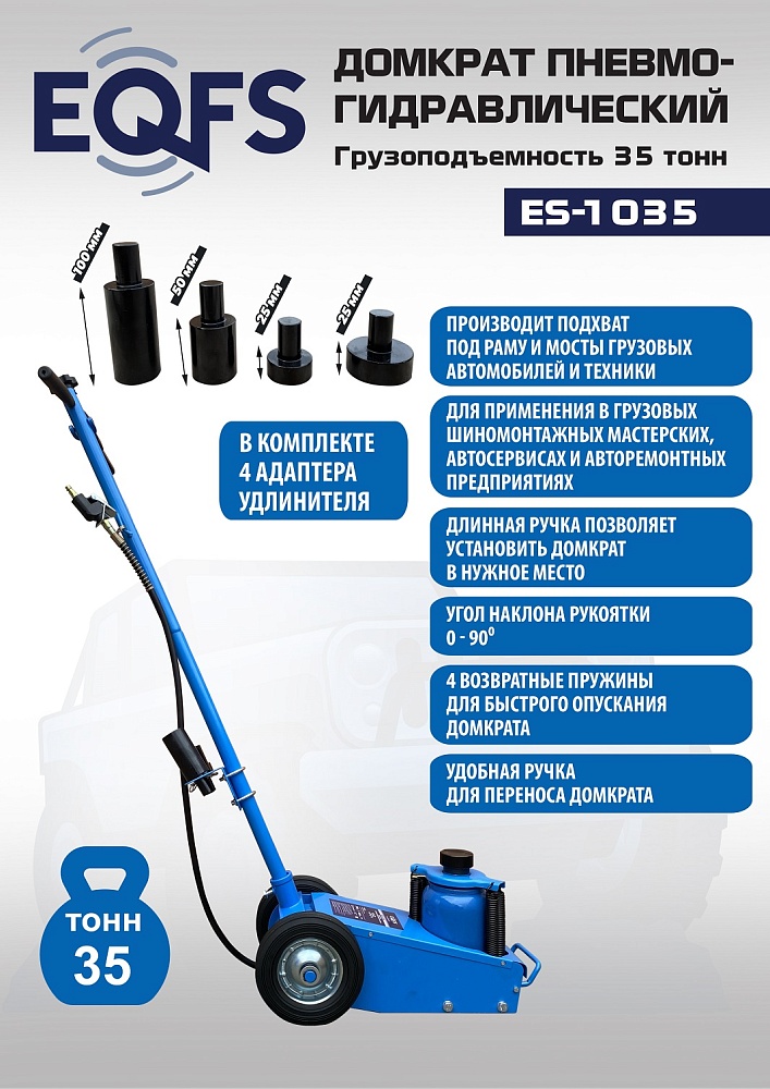 Пневмогидравлический домкрат Г/П - 35 тонн.Прочная и надежная конструкция. Мобильный. Закаленный шток цилиндра обеспечивает надежность работы. 4 возвратные пружины для быстрого опускания домкрата. Разъем для подключения пневмосети. Клапан для быстрого опускания домкрата. Фиксатор угла наклона рукоятки. Угол наклона рукоятки 0-90грд. Удобная ручка для переноски домкрата. В комплекте 4 удлиняющих адаптера: 25 мм, 25 мм, 50 мм, 100 мм. Высота подхвата: 250-495 мм с адаптером 595 мм.<br /><br />Технические особенности ES-1035 пневмогидравлический подкатной домкрат:<ul><li>Прочная и надежная конструкция</li><li>Мобильный - легко перемещается благодаря металлическим обрезиненным колесам по любой поверхности</li><li>Хромированный и закаленный шток цилиндра обеспечивает надежность работы<br /></li><li>4 возвратные пружины для быстрого опускания домкрата</li><li>Разъем для подключения пневмосети с европейским штуцером</li><li>Клапан для быстрого опускания домкрата</li><li>Угол наклона рукоятки 0-90 грд</li><li>Фиксатор угла наклона рукоятки</li><li>Удобная ручка для переноски домкрата</li><li>В комплекте 4 удлиняющих адаптера: 25 мм, 25 мм, 50 мм, 100 мм</li><li>Современный уровень безопасности</li><li>Длительный срок службы<br /></li><li>Выгодная цена</li><li>Емкость бака для заправки 1,5 л. гидравлическое масло</li></ul>