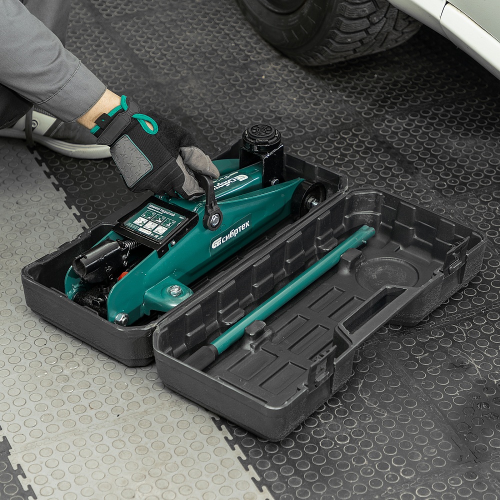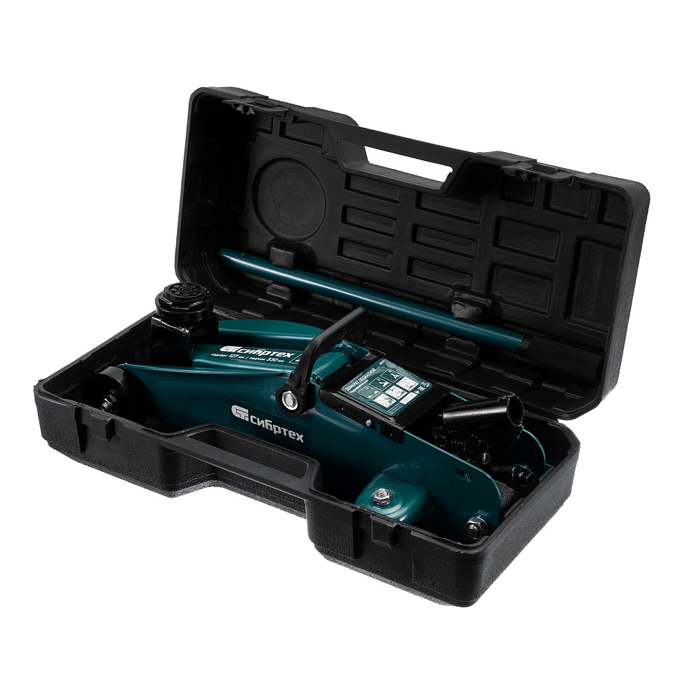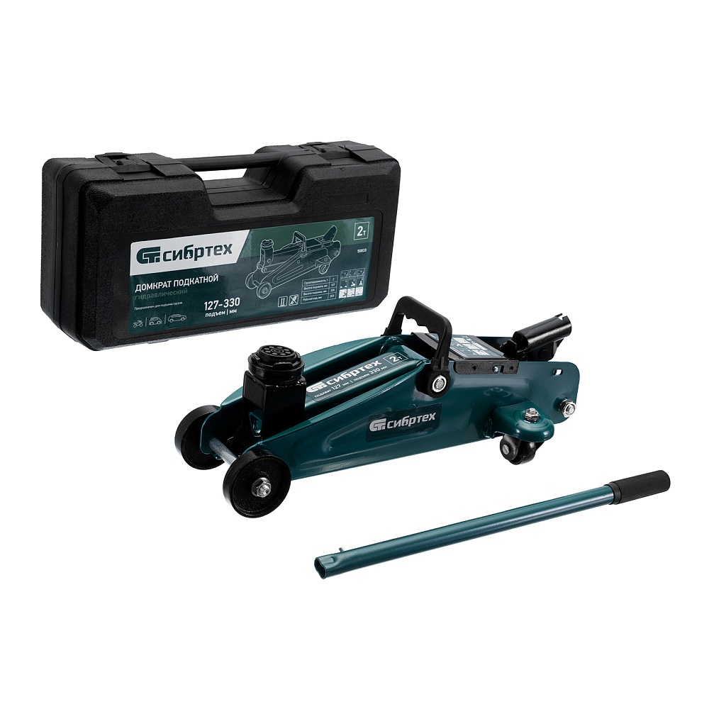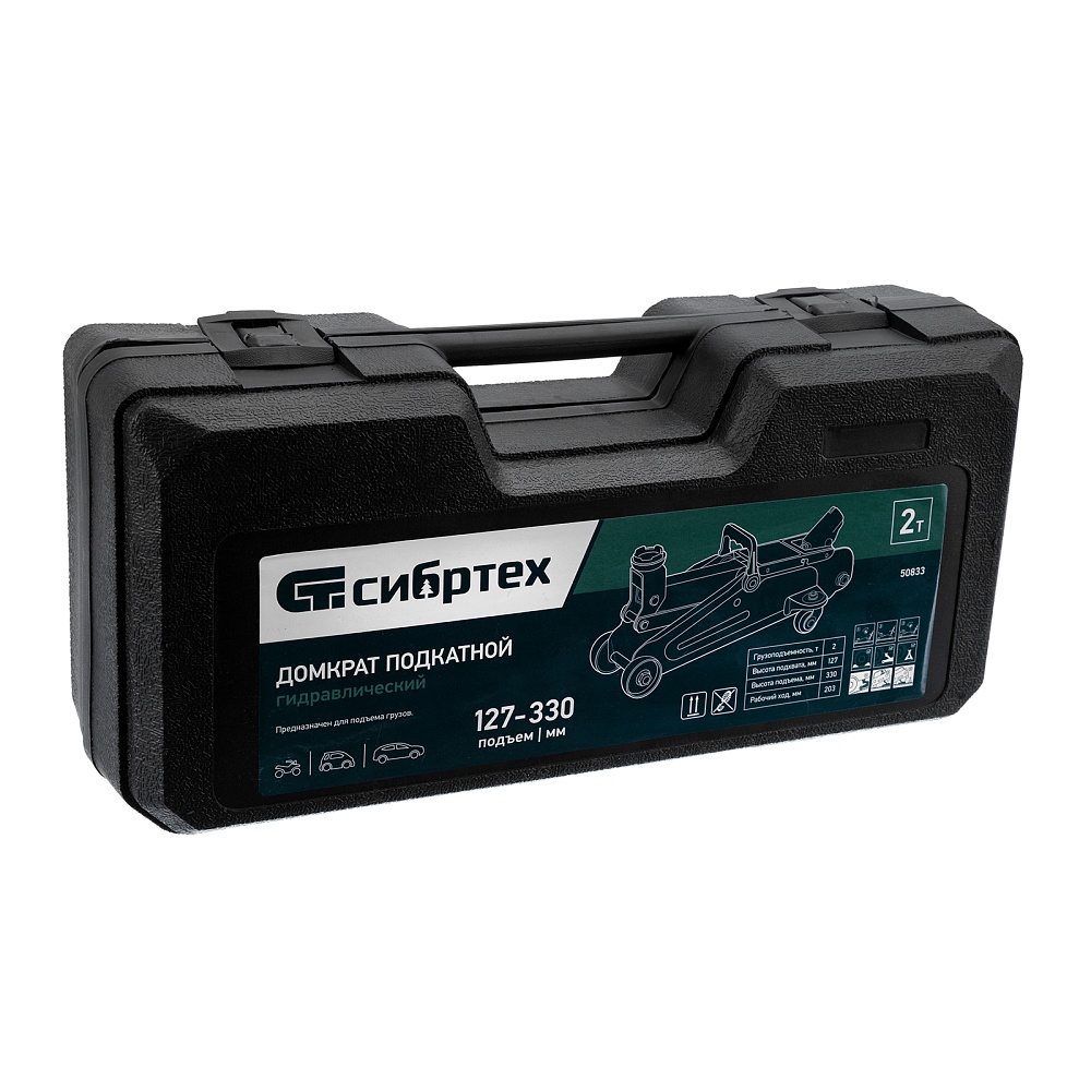 Гидравлический подкатной домкрат Сибртех 50833, поставляющийся в пластиковом кейсе, с высотой подхвата 127 мм, предназначен для подъема грузов массой до 2 т на высоту до 330 мм. Применяется для обслуживания автомобилей со стандартным клиренсом. Компактный домкрат подходит для самостоятельного использования автовладельцами.