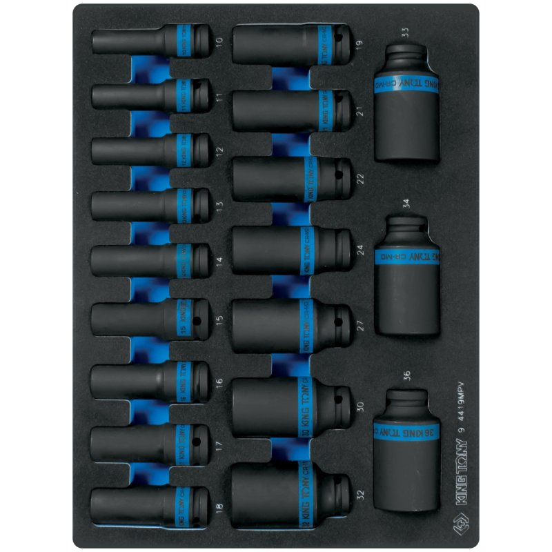KING TONY Набор ударных глубоких торцевых головок 1/2", шестигранные, 10-36 мм, ложемент, 19 предметов KING TONY 9-4419MPV