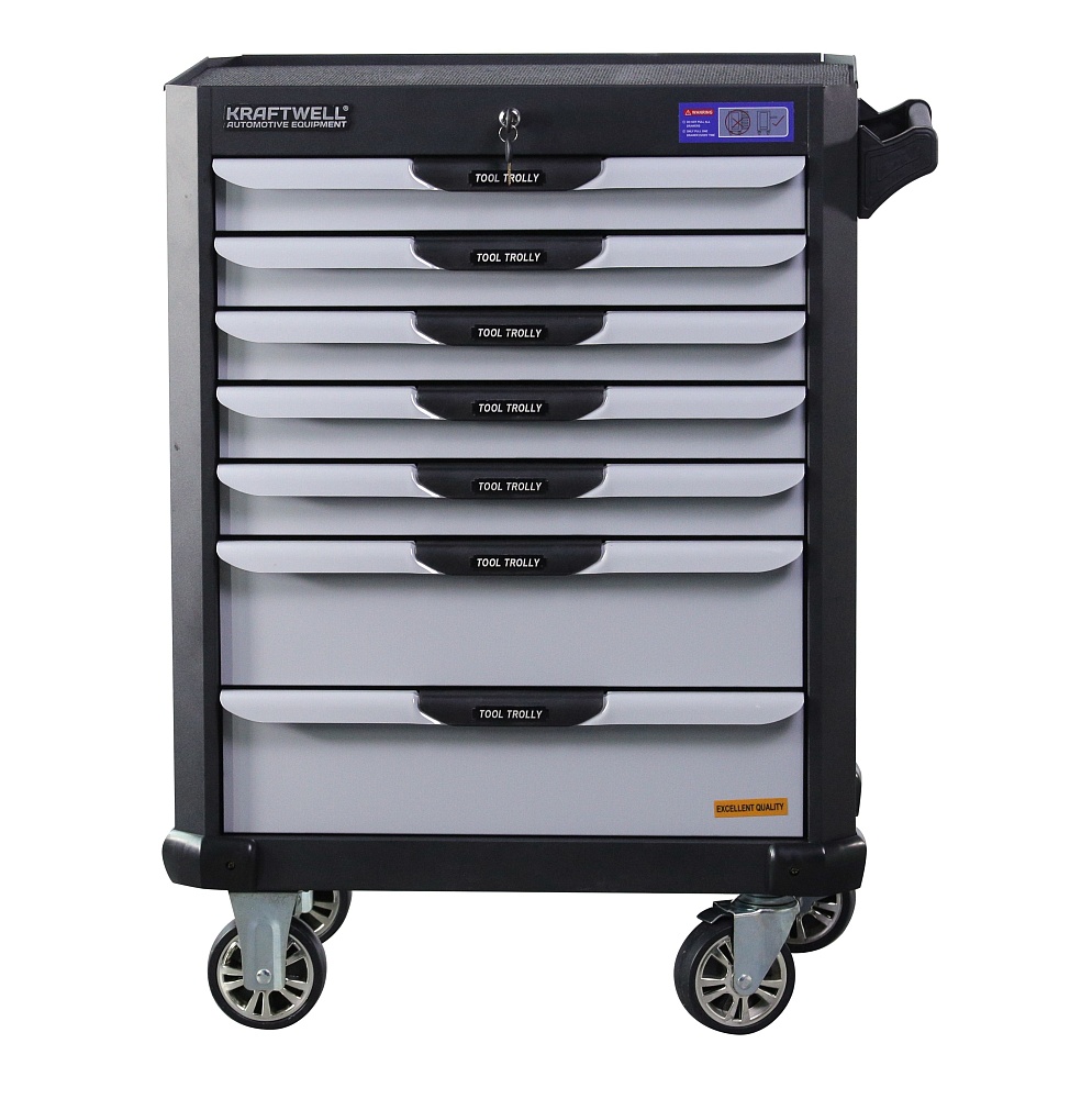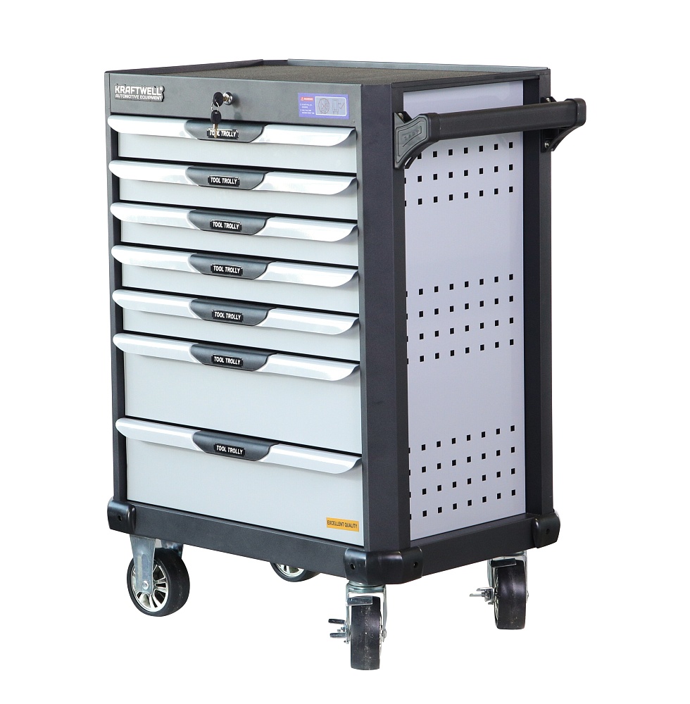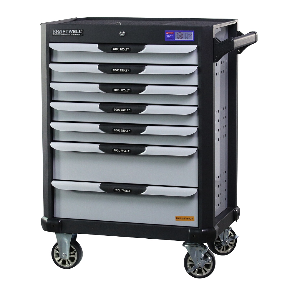 Инструментальная   тележка KRW-TTG оснащена 7-ю выдвижными ящиками.В ПОДАРОК 6 ящиков укомплектованы   ложементами с инструментом (277 предметов). Тележка предназначена для   оборудования рабочих мест в автосервисах, мастерских и других   производственных помещениях. Телескопические направляющие ящиков имеют   механизм фиксации, не позволяющий самопроизвольно открыться ящику, даже если   внутри находится инструмент, а также доводчиком, обеспечивающим плавное   закрытие ящика. Корпус тележки изготовлен из высококачественной стали и   окрашен порошковой краской. Перфорированные боковины предусматривают   установку крючков. Для перемещения тележки предусмотрены обрезиненные   стальные колеса Ф100 мм, одно   из которых имеет стояночный тормоз.