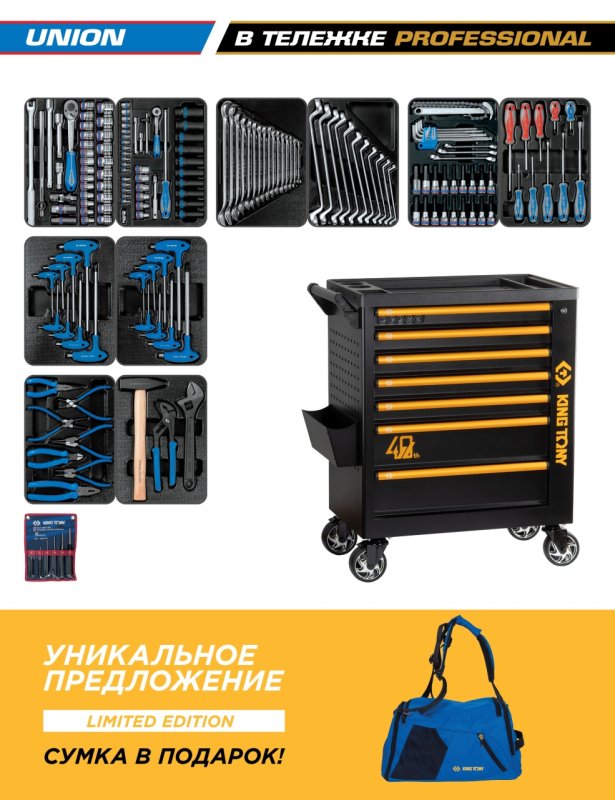 Набор инструментов 173 предмета, "UNION", в черной тележке KING TONY 9G38-000MR40 купить в Краснодаре цена ✅ - Все для СТО