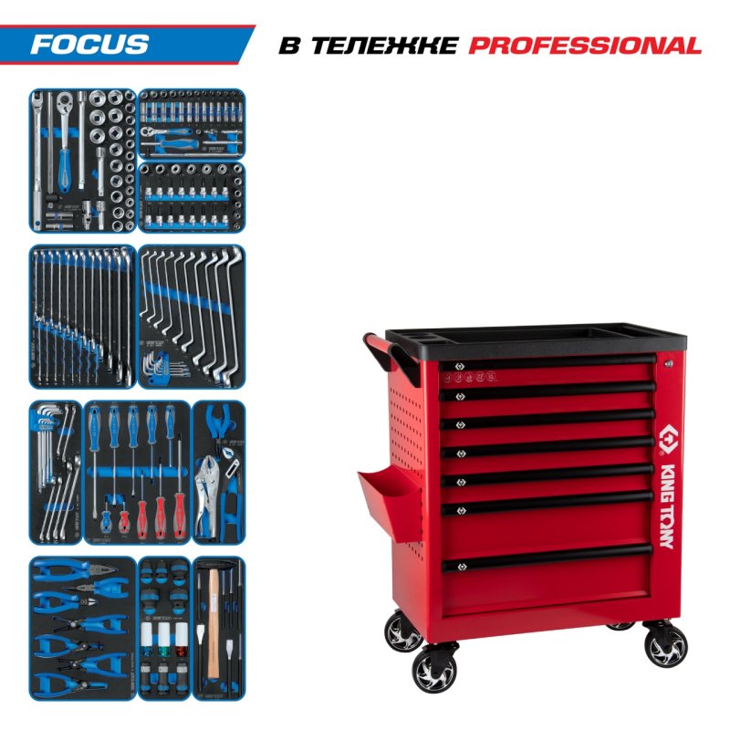 Набор инструментов 188 предметов, "FOCUS", в красной тележке KING TONY 9G38-188MRVR купить в Краснодаре цена ✅ - Все для СТО