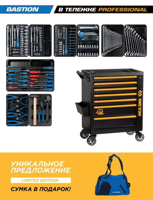 Набор инструментов 204 предмета, "BASTION", в черной тележке KING TONY 9G38-100MR40 купить в Краснодаре цена ✅ - Все для СТО