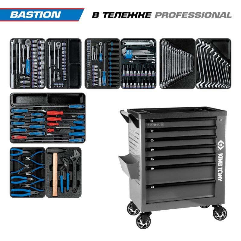 Набор инструментов 204 предмета, "BASTION", в серой тележке KING TONY 9G38-100MRG купить в Краснодаре цена ✅ - Все для СТО