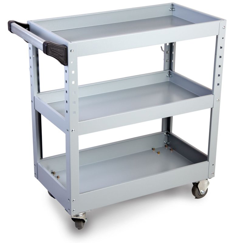 Особо прочные колеса с ножным стопором позволяют передвигать тележку непосредственно в зону проведения работ быстро и безопасно, сокращая временные затраты. Полки выполнены из высокопрочной стали для увеличения срока эксплуатации.