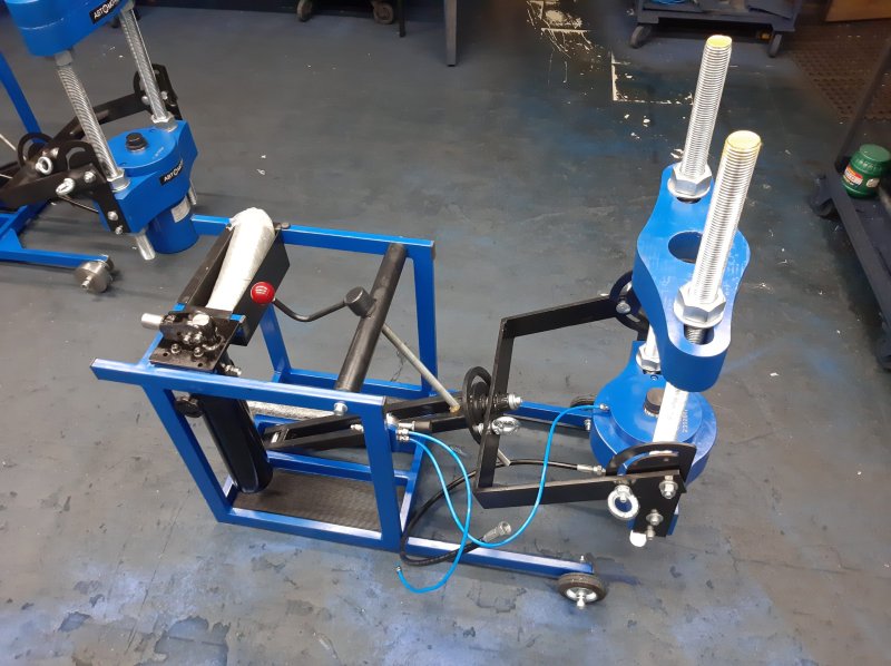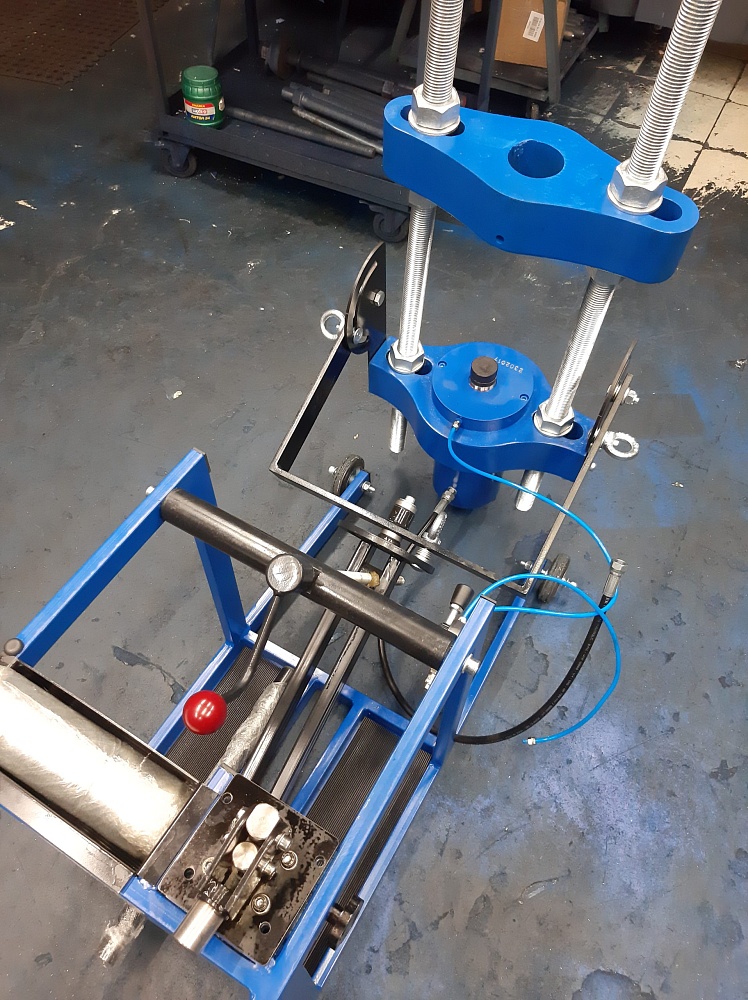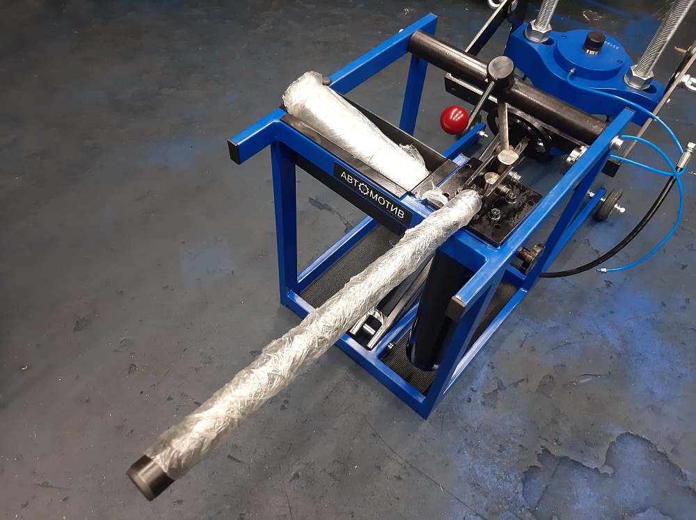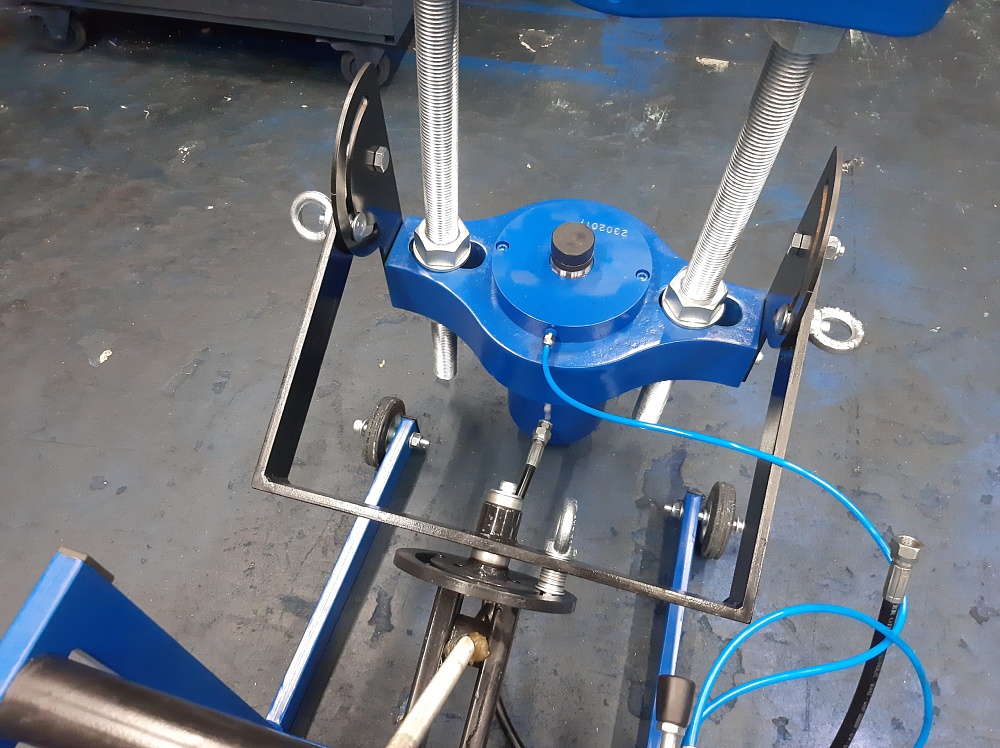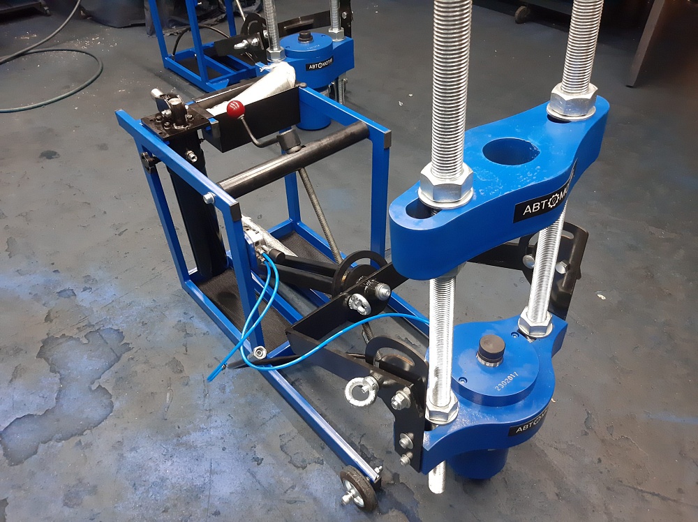 В случае выпрессовщика с тележкой, шарнирно-закрепленная траверса с рабочим цилиндром позволяет поворачивать гидроцилиндр в любое требуемое положение, а при помощи винтовой тяги устанавливать его под любым углом. Поставляется с ручным гидравлическим (по умолчанию) или пневмогидравлическим насосом с комплектом оправок.