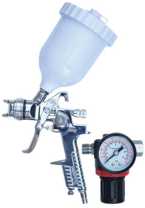 Система краскопульта - HVLP (High Volume Low Pressure) - высокий объем, низкое давление. Конструктивные особенности такой системы - благодаря специальному строению воздушных каналов распыление ЛКМ происходит при низком давлении на выходе и достаточно высоком на входе. Это значительно повышает процент переноса материала на окрашиваемую поверхность, который составляет уже примерно 65 – 70%. Что указывает на более экономичное и экологичное распыление.