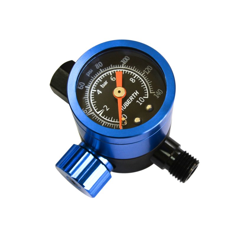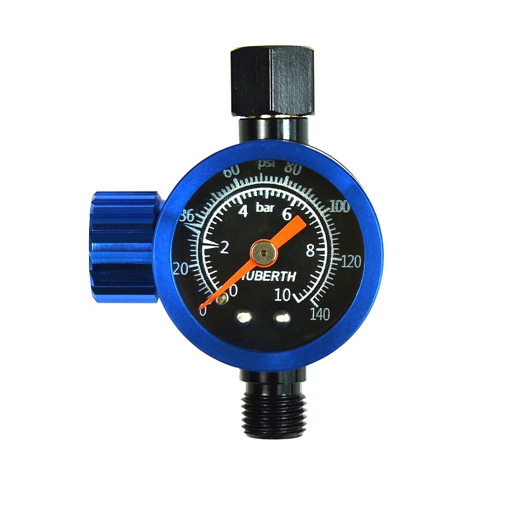 Huberth AR201160B - это надежный механический стрелочный манометр  с установкой на ручку окрасочного пистолета и резьбовым входом и выходом для измерения давления воздуха. Манометр Huberth AR201160B оснащен поворотным регулятором для оперативной настройки воздушного потока.
