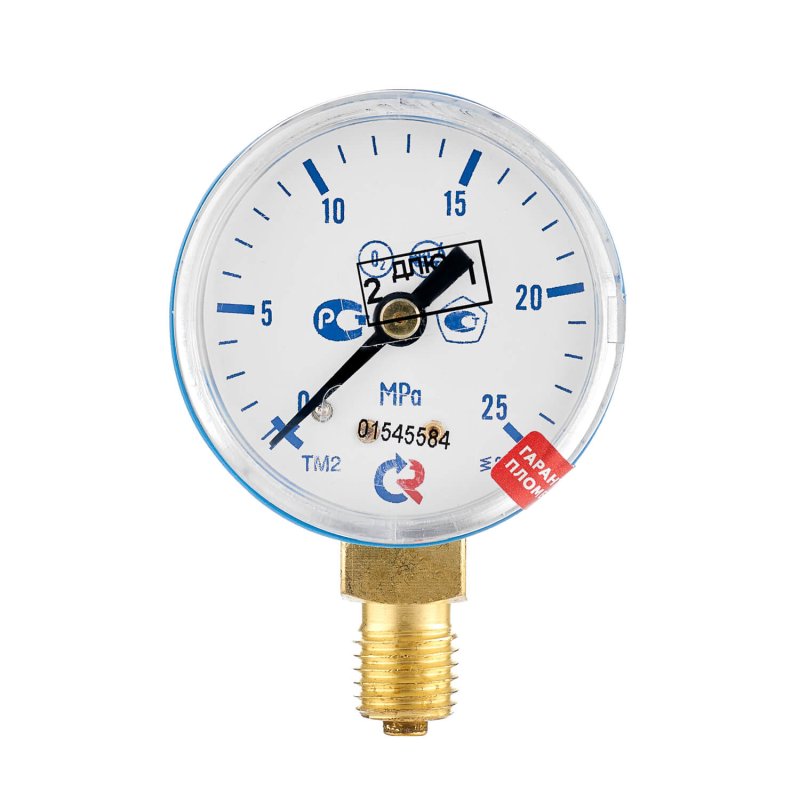 Сварочный манометр для кислорода с диапазоном измерений показаний давления от 0 до 25,0 МПа. Манометр предназначен для измерения давления жидких и газообразных, не вязких и не кристаллизующихся измеряемых сред, неагрессивных к медным сплавам. Широко применяются в баллонных редукторах.