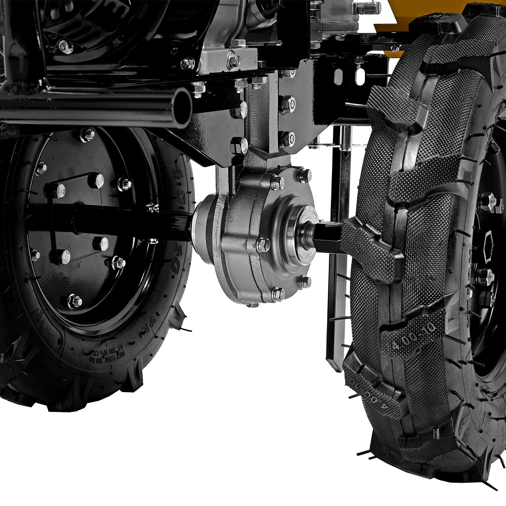 <p>Мотоблок Denzel 56406 DPT-370X мощностью 7 л.с., с дисковым сцеплением, фрезами 3 х 4, валом отбора мощности (ВОМ), передачами 3В/1Н, имеет ширину вспахивания 90 см и глубину обработки 35 см. Предназначен для обработки почвы: рыхления, боронования, выравнивания, прополки и выполнения других задач на приусадебных и садовых участках, уверенно справляется с плотной глинистой почвой.,Мощный и экономичный одноцилиндровый четырехтактный двигатель Denzel серии Long Life с рабочим объемом 212 см3 отличается надежностью и продолжительным ресурсом. Многодисковый механизм сцепления обеспечивает передачу высокого крутящего момента на колеса. Мотоблок предназначен для работы на большой территории и широко используется в быту.</p><h2>Преимущества</h2><ul><li>Высокопроизводительная коробка передач — 3 передачи вперед и одна назад позволяют подстраиваться под тип почвы и легко извлекать почвофрезы из любого грунта.</li><li>Удобная эксплуатация — рукоятки руля регулируются в 2 плоскостях — вертикально и относительно продольной оси машины.</li><li>Легкое управление — регулятор оборотов двигателя, выключатель зажигания и рычаг сцепления находятся на рукоятке перед пользователем.</li><li>Усиленный сошник толщиной 12 мм — можно менять глубину вспахивания, удерживать равновесие при обработке почвы и использовать его в качестве задней опоры при хранении мотоблока.</li><li>Многофункциональность и экономия бюджета — вал отбора мощности позволяет подключать к мотоблоку активное навесное оборудование.</li><li>Защита от работы при низком уровне масла LO-protection — мотоблок не включится при незаполненном картере, такое решение предотвращает поломку двигателя и продлевает срок службы техники.</li><li>Безопасная работа — широкие крылья защищают пользователя от вылетающих фрагментов почвы, камней и прочих предметов.</li><li>Низкий расход топлива 1 л/ч — можно непрерывно работать более 3-х часов, не отвлекаясь на заправку.</li><li>Долговечность — чугунный корпус редуктора и стальные фрезы (в комплекте поставки 24 шт.) отличаются особой прочностью.</li><li>Надежный карбюратор — мотоблок работает стабильно даже при высокой нагрузке на двигатель.</li><li>Качественные детали — закаленный до твердости 45-50 HRС стальной коленвал и надежный распредвал обеспечивают высокую производительность мотоблока в любое время года.</li><li>Воздушный фильтр — поступающий в цилиндр воздух очищается от твердых частиц, что обеспечивает его высокий ресурс — это особенно важно при обработке сухой почвы.</li><li>Эргономичность — рукоятки изогнутой формы находятся на оптимальном расстоянии друг от друга и усилены стальной перекладиной, поэтому пользователь не устанет даже при длительной работе.</li><li>Комфортная транспортировка — усиленная рукоятка-бампер и большие колеса с глубоким протектором позволяют с легкостью перемещать мотоблок до нужного места.</li><li>Складная ножка — дополнительная опора позволяет удобно располагать мотоблок в зоне хранения без риска опрокидывания.</li><li>Расширенная гарантия 3 года — качество мотоблока подтверждено производителем.</li></ul>