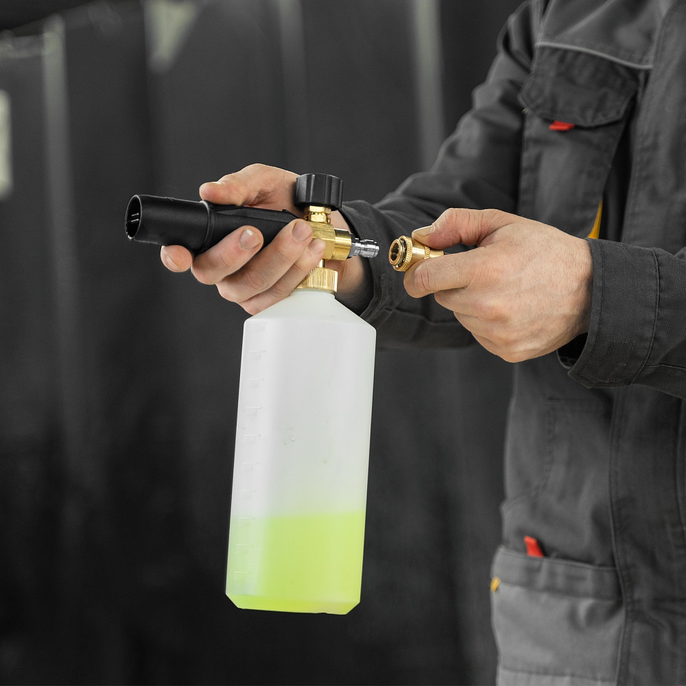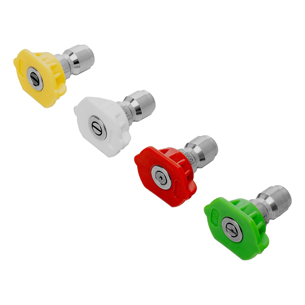 Мойка высокого давления, Шланг высокого давления, Пистолет моечный, Насадка-удлинитель, Форсунки 4 шт., Пеногенератор с бачком для моющего средства, Входной штуцер с фильтром, быстросъемный коннектор шланга, Игла для прочистки сопла, Инструкция по эксплуатации с гарантийным талоном