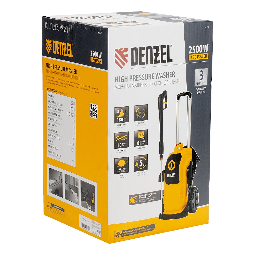 <p>Моечная машина высокого давления Denzel K 70 Power 58272 мощностью 2500 Вт и производительностью 600 л/ч, с асинхронным двигателем, обеспечивает подачу воды под давлением до 180 бар. Позволяет при помощи струи воды отмыть фасад дома, дорожку, тротуар, садовую мебель, технику и инструменты, автомобиль, окна и т.д. Машина оснащена самовсасывающим насосом, поэтому может работать даже при отсутствии доступа к водопроводной сети, забирая воду из открытого источника. Надежный асинхронный двигатель с водяным охлаждением устойчив к нагрузкам и не требует сложного обслуживания. Машина оптимальна для бытового применения.</p><h2>Преимущества</h2><ul><li>Высокий ресурс — профессиональная алюминиевая помпа с водяным охлаждением обеспечивает стабильное давление в течение длительного времени: испытаниями подтверждена возможность непрерывной работы на протяжении 700 часов.</li><li>4 насадки в комплекте — возможно распыление под углом 0, 15, 25 и 40° для наиболее эффективного решения поставленных задач.</li><li>Эффективное очищение — возможно использование моющих средств, для этого предусмотрен специальный бачок с насадкой пеногенератора.</li><li>Защита от засоров — фильтр входного штуцера препятствует попаданию посторонних частиц внутрь машины.</li><li>Быстрая подготовка к работе — быстросъемный адаптер упрощает подключение входного шланга.</li><li>Продуманная конструкция — сменные насадки и бачок для моющего средства крепятся на корпус машины, поэтому он всегда будут под рукой и не потеряются.</li><li>Степень защиты IPX5 — внутренние элементы машины надежно изолированы от попадания влаги.</li><li>Защита от непроизвольного запуска — для включения машины необходимо разблокировать рычаг моечного пистолета.</li><li>Автоматический контроль давления — манометрический выключатель останавливает насос при прекращении подачи воды, перепускной клапан предотвращает превышение допустимого рабочего давления.</li><li>Термозащита — в случае перегрева двигатель отключается для предотвращения поломки.</li><li>Простое обслуживание — игла для прочистки сопла входит в комплект поставки.</li><li>Мобильность — машину удобно перемещать благодаря телескопической рукоятке и большим колесам.</li><li>Свободное перемещение по участку — длина шланга высокого давления составляет 8 м, длина кабеля — 5 м.</li><li>Гарантия 3 года — надежность моечной машины подтверждена производителем.</li></ul>