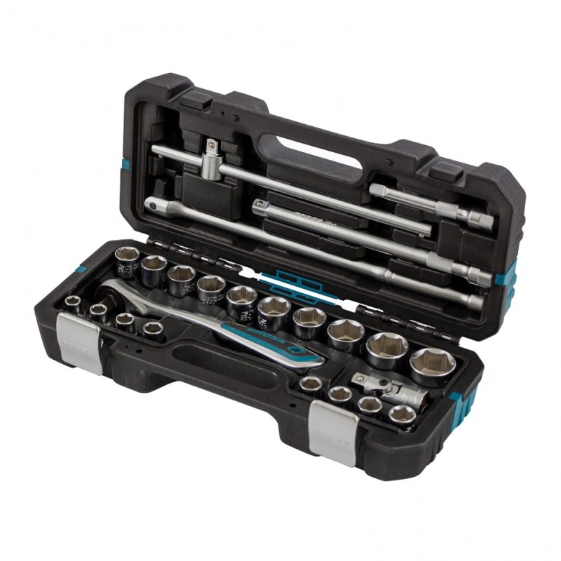 Набор инструментов Gross 14147 из стали CrV используется для закручивания и откручивания резьбового крепежа и включает 24 предмета, в том числе ключ-трещотку со 120 зубьями и присоединительным квадратом 1/2"". Комплект адаптирован для работы в труднодоступных местах — для этого предусмотрены удлинители, воротки и карданный шарнир. Набор подойдет для самостоятельного ремонта автомобилей и выполнения бытовых работ.ПреимуществаПрочность и износостойкость — инструменты выполнены из высокопрочной хромованадиевой стали.Работа со значительным усилием — трещоточный ключ с цельнокованым корпусом выдерживает высокие нагрузки.Реверс — ключ-трещотка способен не только закручивать, но и откручивать крепежи.Удобная работа в труднодоступных местах — механизм трещотки имеет 120 зубьев, что обеспечивает мягкость и плавность хода, угол поворота составляет всего 3°.Дополнительные возможности — удлинители с профилем под гаечный ключ позволяют увеличивать воздействие на крепеж.Комфортный захват — благодаря специальным насечкам торцевые головки и удлинители не выскальзывают даже из замасленных рук.Удобное хранение и транспортировка — набор поставляется в кейсе из ударопрочного пластика с крепкими металлическими замками и ложементом.