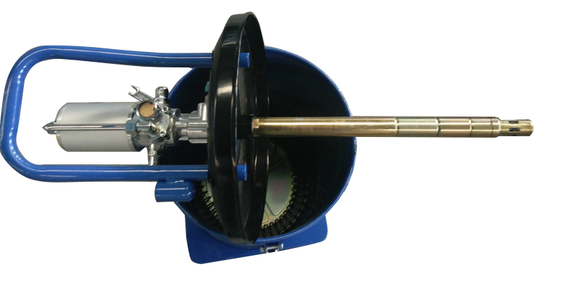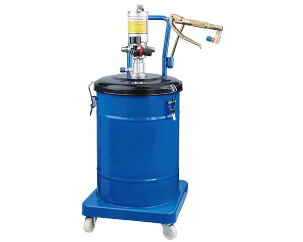 Конструкция состоит из бака для солидола объемом 30 л, насосного агрегата с пневмоприводом, армированного шланга, быстросъемного соединителя и раздаточного пистолета. За счет колес, прикрепленных к устройству, его легко перемещать по рабочей зоне.