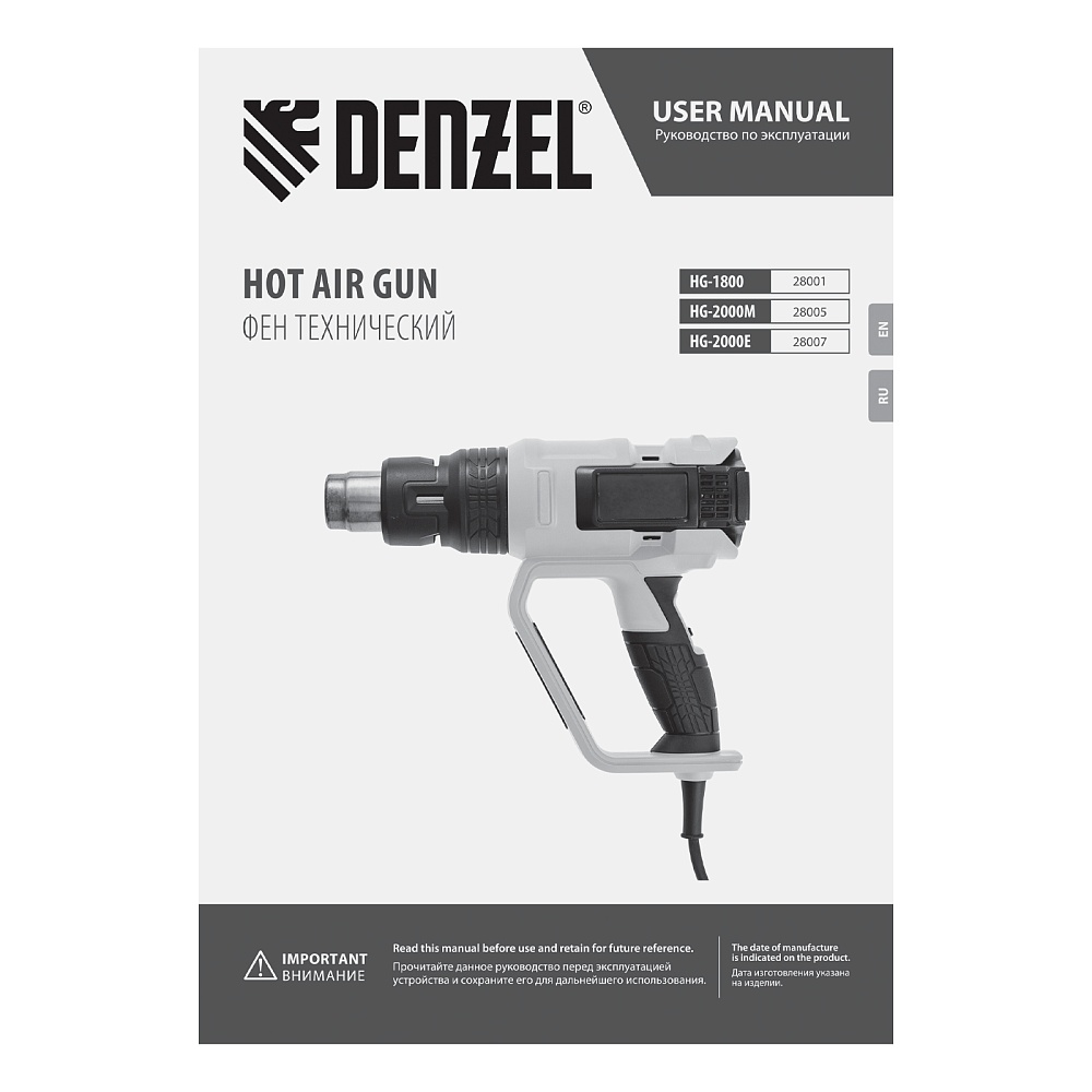 <p>Фен технический Denzel HG-1800 28001 мощностью 1,8 кВт работает в 3 режимах: с температурой 50/450/550 ℃ и производительностью 250/250/500 л/мин соответственно. Используется в качестве источника горячего воздуха для нагрева и просушивания различных материалов, снятия лакокрасочных покрытий, сварки изделий из пластика, дезинфекции поверхностей, а также при проведении слесарных работ, ремонта и строительства. Набор стандартных опций без лишнего функционала обеспечивает идеальное соотношение цены и качества, делает инструмент оптимальным вариантом для бытового применения.</p><h2>Преимущества</h2><ul><li>Двухступенчатая защита от перегрева — работа автоматически прекращается при возникновении нештатных ситуаций, например, при перекрытии выходного отверстия.</li><li>Наличие режима продувки при температуре 50 ℃ — фен можно использовать для деликатной сушки, а также охлаждать по завершении работы, что сводит риск перегрева к минимуму.</li><li>Продуманная конструкция — фен отлично сбалансирован, его можно установить на плоской поверхности соплом вверх без специальной подставки, чтобы избежать отключения при перерывах в работе.</li><li>Высокий ресурс — каркас нагревательного элемента сделан из самого жаростойкого материала — прессованной слюды, а также дополнен керамическими вставками.</li><li>Комфортная работа — фен весит 0,75 кг, эргономичная рукоятка обеспечивает удобный захват и облегчает выполнение интенсивной работы.</li><li>Надежный кабель длиной 3 м — не придется использовать удлинитель, а благодаря резиновой изоляции можно работать в условиях низких температур.</li><li>Аксессуары в комплекте — треугольный скребок и насадки (плоская, полукруглая, отражающая и редукционная) прилагаются, это экономит ресурсы пользователя на поиск аксессуаров.</li><li>Гарантия 3 года — высокое качество инструмента подтверждено производителем.</li></ul>