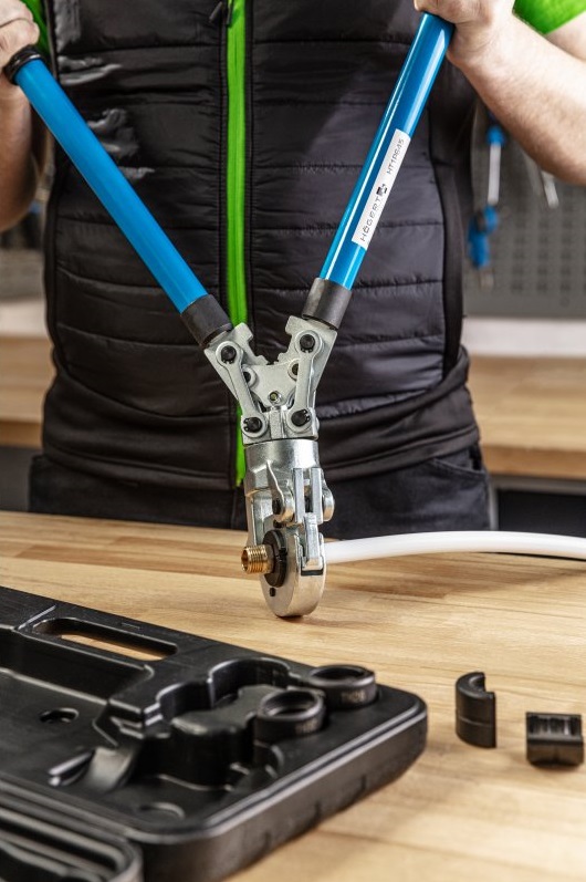Ручной обжимной инструмент типа TH, предназначенный для обжима фитингов на трубах PEX-AL-PEX и PERT-AL-PERT. Позволяет точно и плотно обжать фитинги. Телескопические рукоятки позволяют удлинять их с 58 до 76 см, увеличивая таким образом усилие, необходимое для обжима соединителя. Система быстрой смены матриц.