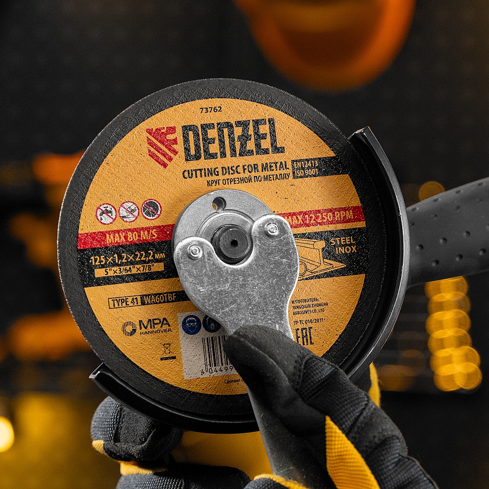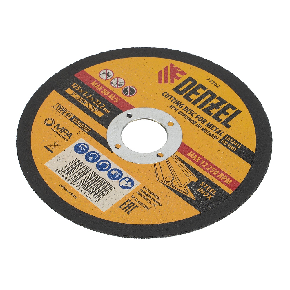 <p>Отрезной круг по металлу Denzel WA60TBF 73762 размером 125 х 1,2 х 22,2 мм рассчитан на интенсивную работу с УШМ. Подходит для резки углеродистой и нержавеющей легированной стали. Круг можно использовать не только в быту, но и для решения профессиональных задач.</p><h2>Преимущества</h2><ul><li>Эффективность — абразив из белого электрокорунда со специальными добавками быстро режет сталь, в т.ч. нержавеющую, и не перегревается, в отличие от оксида алюминия.</li><li>Аккуратная работа — благодаря толщине 1,2 мм и средней по плотности структуре круг обеспечивает ровный и чистый рез.</li><li>Надежность — оптимально подобранная теплостойкая бакелитовая связка с упрочняющими элементами крепко удерживает абразив.</li><li>Безопасная работа — усиленная стеклосетка увеличивает прочность круга на разрыв, предотвращая его разрушение при высоких нагрузках.</li><li>Высокое качество — круг прошел строгий технологический контроль на каждом этапе производства.</li></ul>