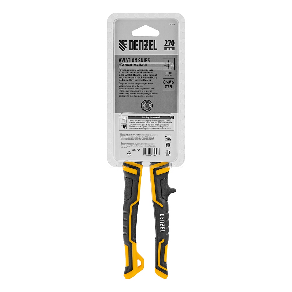 <p>Ножницы по металлу Denzel 78372 общей длиной 270 мм, из стали-CrMo, с трехкомпонентными рукоятками, предназначены для прямого и левого реза листовых металлических заготовок и металлопрофиля толщиной до 1,2 мм. Инструмент с усиленной конструкцией осевого шарнира рассчитан на профессиональное использование. Ножницы используются для проведения строительных, кровельных и слесарных работ.</p><h2>Преимущества</h2><ul><li>Высокое качество исполнения — ножницы изготовлены из прочной хромомолибденовой стали методом горячей штамповки, остро заточенные кованые лезвия с насечками не соскальзывают с заготовок.</li><li>Эффективность — режущие кромки закалены до твердости 60-62 HRC и легко справляются даже с прочной «нержавейкой».</li><li>Безопасность — блокировочный замок предотвращает случайное раскрытие лезвий во время транспортировки и хранения.</li><li>Комфортная работа — плоский соединительный винт не цепляется за заготовки, удлиненные трехкомпонентные рукоятки не выскальзывают из руки.</li><li>Удобное хранение — на рукоятке имеется проушина для подвешивания на крючок или гвоздь.</li></ul>