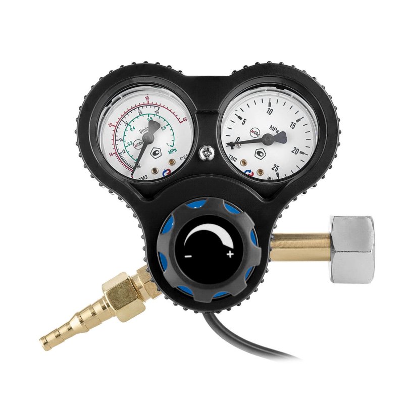 Регулятор расхода газа из линейки PROTEC с надежной защитой корпуса и манометров и подогревателем на 36 Вольт. Регулятор с манометром и манометром-расходомером для углекислоты и аргона. Корпус из алюминия. Поставляется в комплекте с ниппелем 6/9 мм и гайкой M16х1,5.