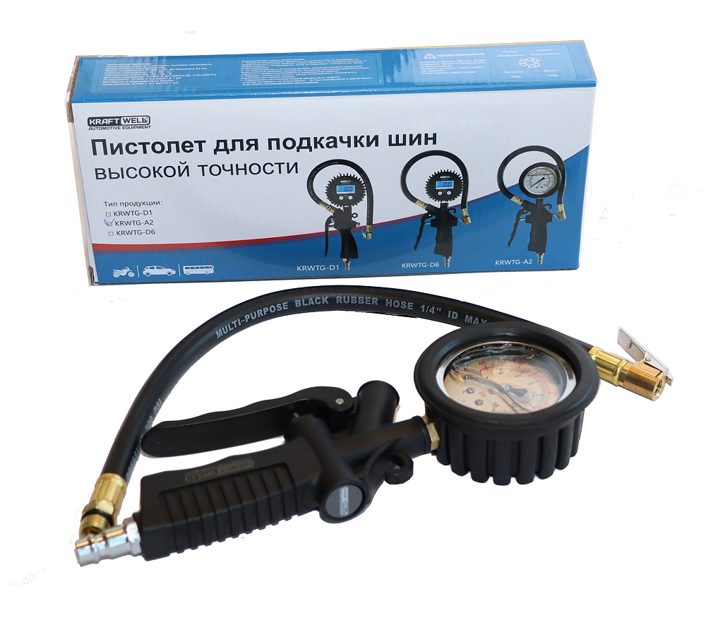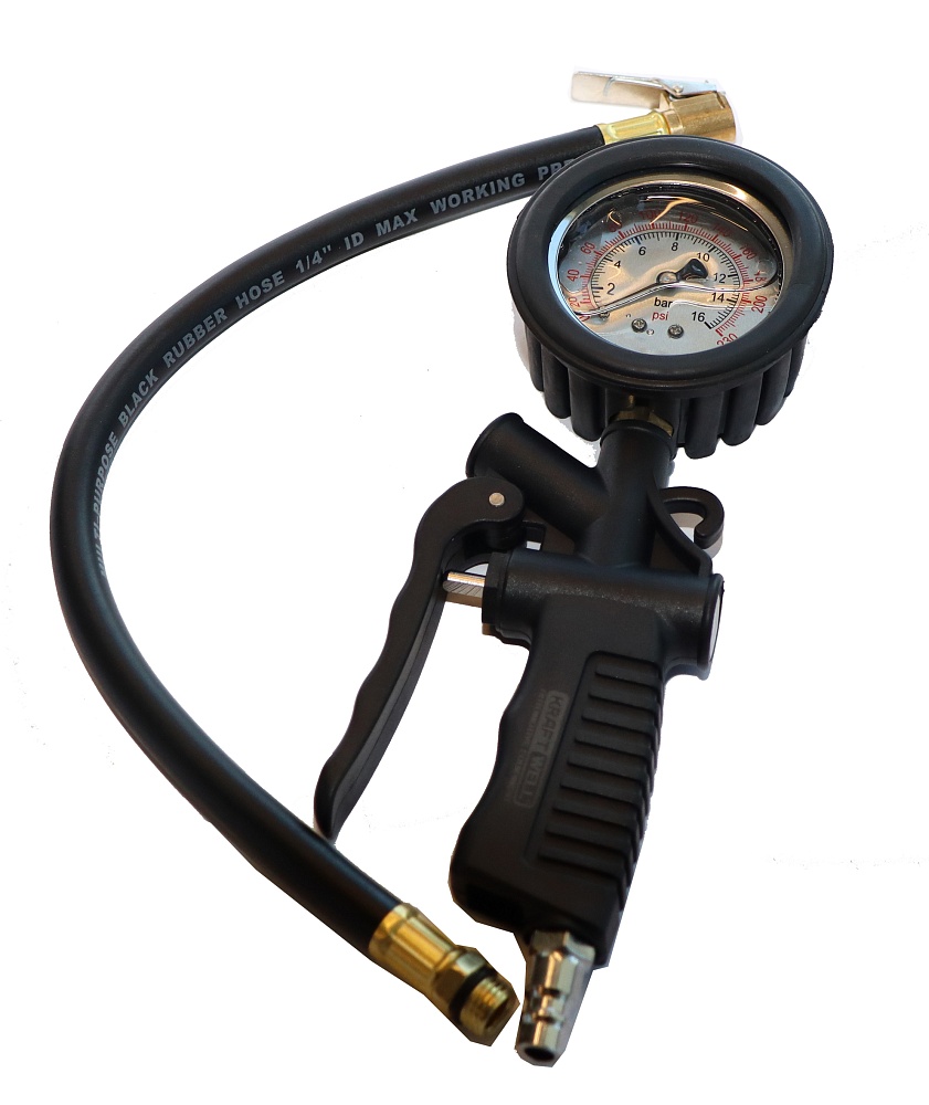 KRWTG-A2 KraftWell Пистолет для подкачки шин. В цветной коробке. Аналоговый жидкостный манометр. Пластиковая рукоятка, пластиковый курок. Давление до 16 бар.