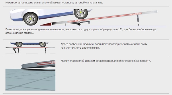 Стапель имеет классическую американскую конструкцию с большой платформой и силовыми устройствами башенного типа. Изготовленная из листового металла, ровная и просторная платформа 5,2 х 2,1 м позволяет закреплять широкую гамму автомобилей от малолитражек, до внедорожников и легких грузовиков весом до 3500 кг. Рабочая высота платформы 63 см обеспечивает легкий доступ к любой части автомобиля.