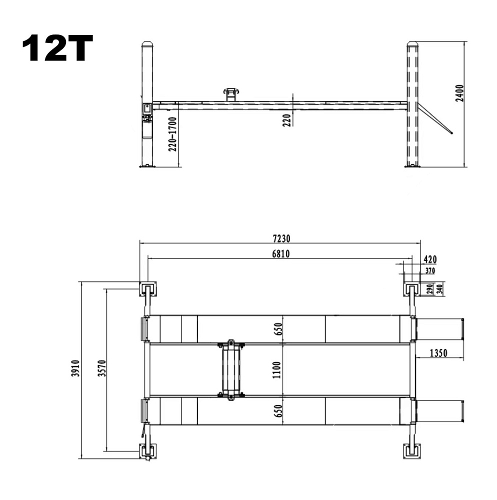 KRW10FPL KraftWell Подъемник четырехстоечный, электрогидравлический, г/п 10 000 кг., 3 кВт, высота подъема 1700 мм., размеры платформ 6810х650 мм, платформы - гладкие. В комплекте с пневматичекой траверсой г/п 5 000 кг.