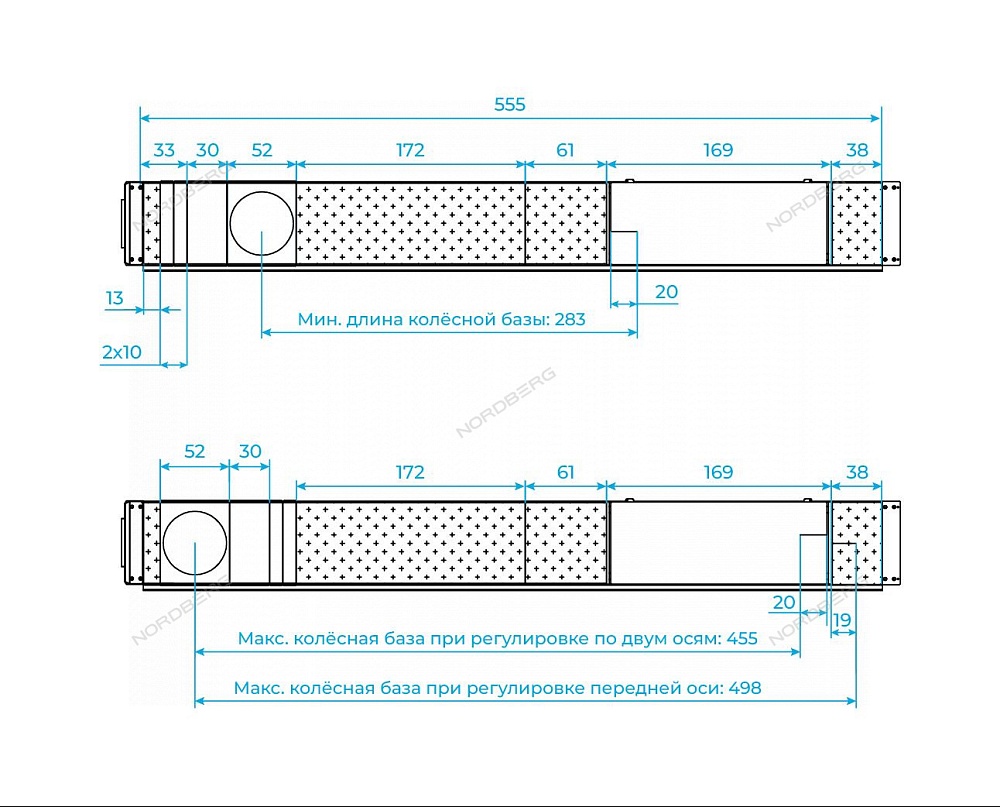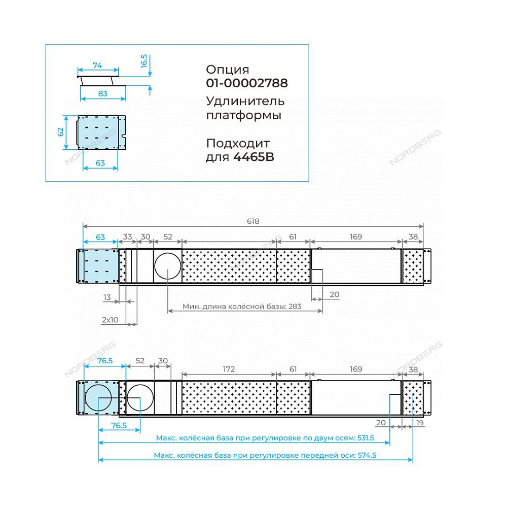 • При установке удлинительных платформ 01-00002788 длина рабочей поверхности увеличивается на 63 см и составляет 618 см. Это позволяет работать с транспортом с увеличенной базой и удлинённым кузовом;