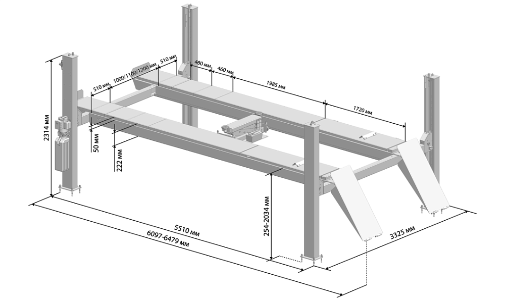 • Удлиненный четырехстоечный подъемник для работы с автомобилями общей массой до 6,5 тонн