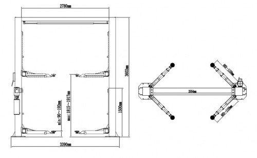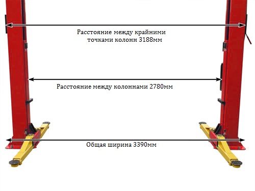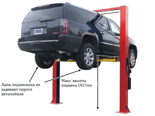 Подъемник двухстоечный электрогидравлический с управлением стопорами на одной колонне, асимметричный, двухцилиндровый, г/п 4000 кг., 2,2 кВт, высота подъема 1825 мм., расстояние между стойками 2820 мм., с нижней синхронизацией.