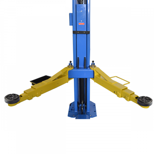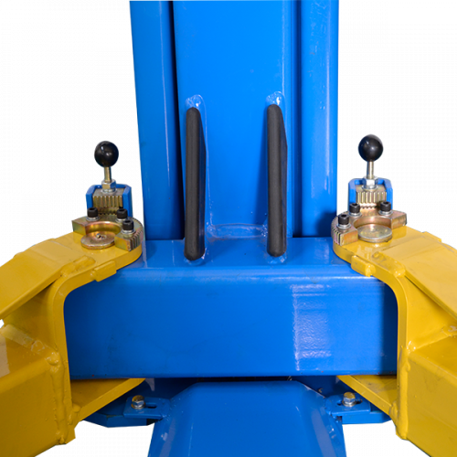 Двухстоечный электрогидравлический подъемник с нижней синхронизацией, грузоподъемность 4 т, механическое управление стопорами на одной колонне.