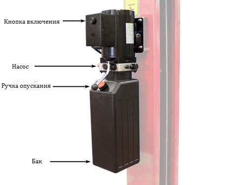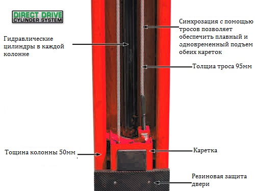 Двухстоечный электрогидравлический подъемник с верхней синхронизацией, грузоподъемность 4.5 т, высота колонны 3854мм, механическое управление стопорами на одной колонне.