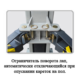 Электрогидравлический двухстоечный подъемник с нижней синхронизацией Снятие со стопоров каретки с одной колонны Усиленная конструкция каретки и колонн Трехсекционные подхваты для обслуживания всех видов легкового транспорта