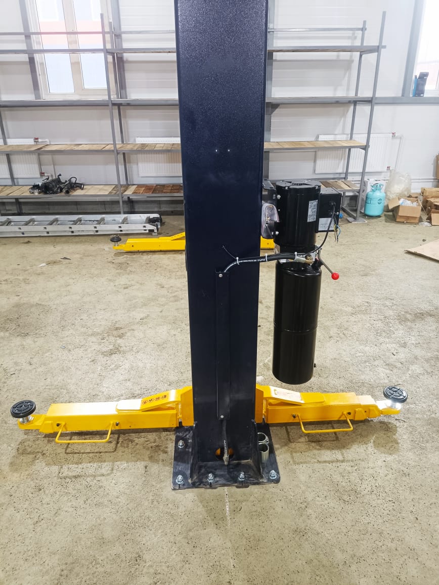Подъемник двухстоечный электрогидравлический с управлением стопорами на одной колонне, асимметричный, двухцилиндровый, г/п 4000 кг., 2,2 кВт, высота подъема 1800 мм., расстояние между стойками 2680 мм., с нижней синхронизацией.