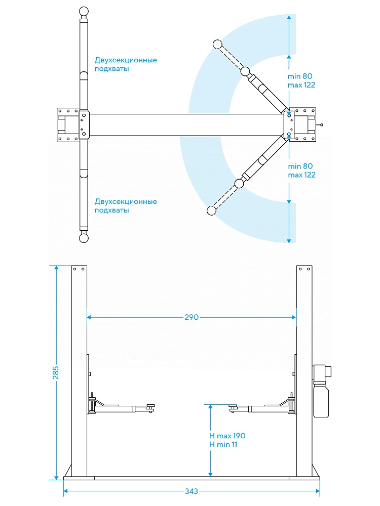 Высота подъёма 1825 мм, высота подъемника 2824 мм, общая ширина подъемника 3380 мм, расстояние между стойками 2820 мм.
