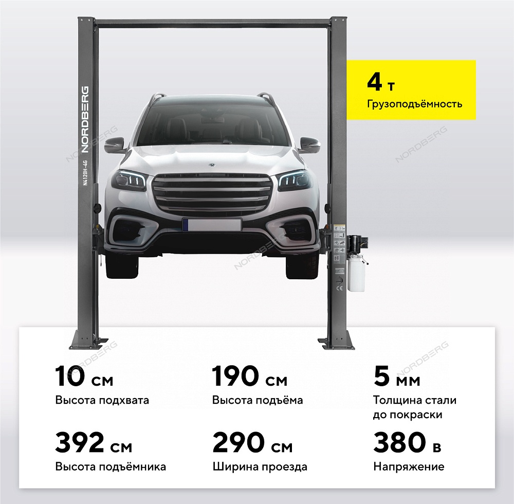 Подъемник двухстоечный 4 т, верхняя синхронизация, H=3,6 м, 380 В, серый NORDBERG N4120H-4G_3+2_380 купить в Краснодаре цена ✅ - Все для СТО