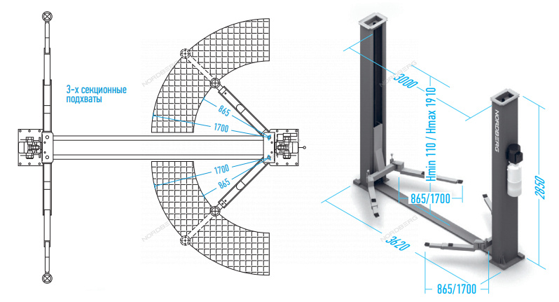 Nordberg N4120B-4T _220V 4-х тонный электрогидравлический подъемник с нижней тросовой синхронизацией, со снятием стопоров с одной колонны