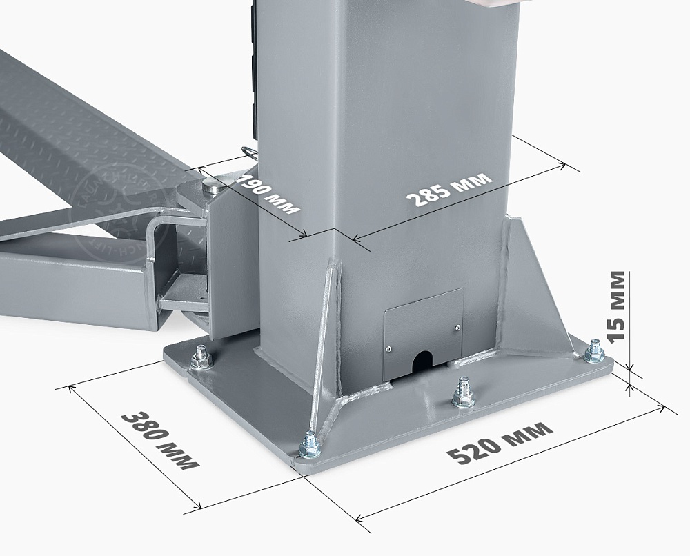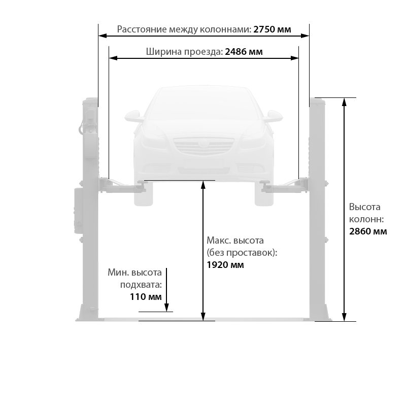 ПГН2–4.0 (A) Подъёмник 2‑стоечный с нижней синхронизацией, 380В Грузоподъемность: 4 тонны Электропитание: 380 В Вес подъемника: 623 кг Расстояние между стойками: 2800 мм