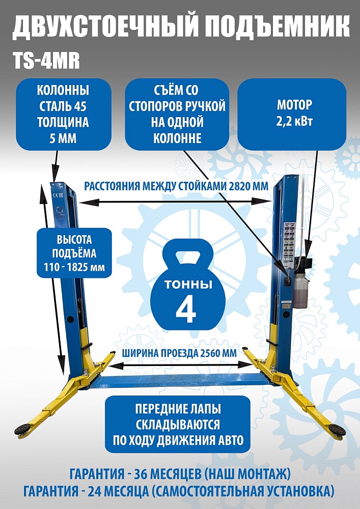 TS-4MR Подъемник 2-хст. г/п 4 т съем-ручка+проставки (2025) (380 V ТВ)