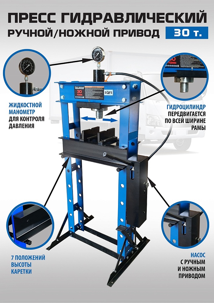 Пресс гидравлический. «Свободные руки» — ножной / ручной. Усилие 30 тонн. Поршень приводится в действие нажатием на ручку или педаль. Рекомендуется для выпрессовки деталей машин, втулок и т.п. в автосервисе, гараже и СТО. Гидроцилиндр с пуансоном имеет возможность перемещения по всей ширине каретки. Цвет синий. Подъёмная площадка регулируется по высоте и фиксируется в требуемом положении. Пуансон 0-160 мм. Рабочее окно 530х980 мм. Доставка по РФ и ТС.