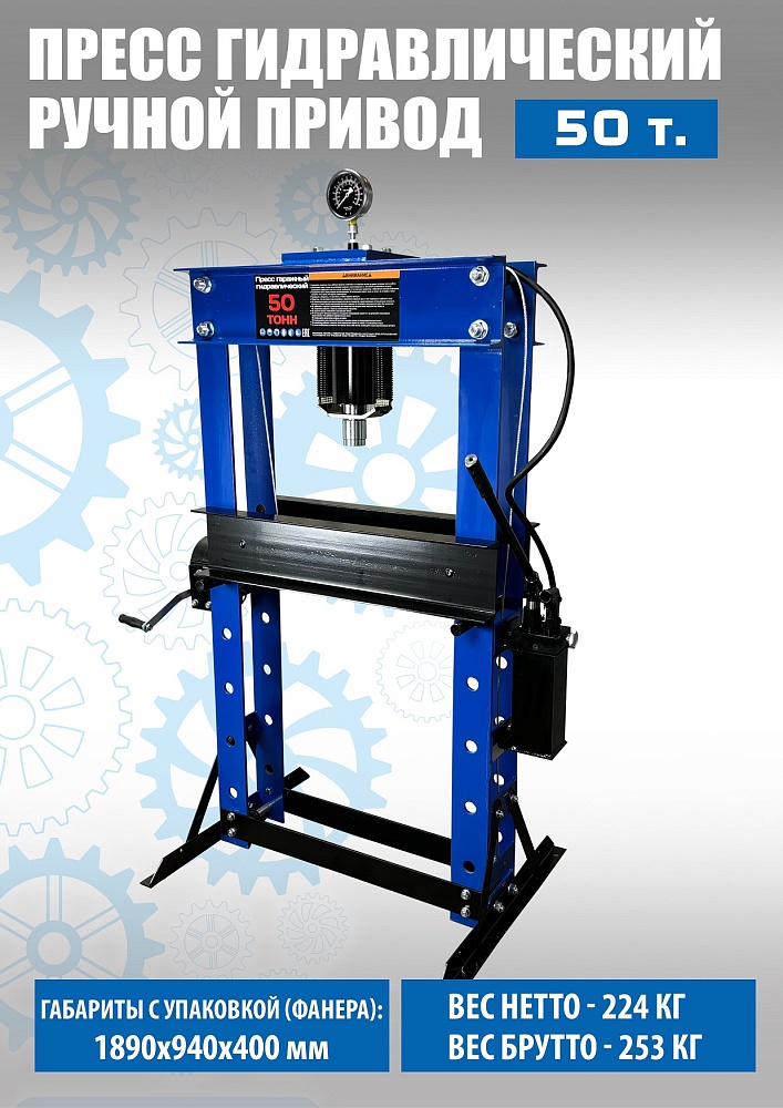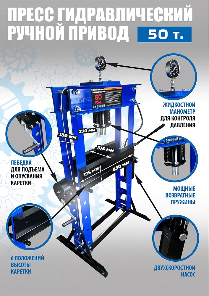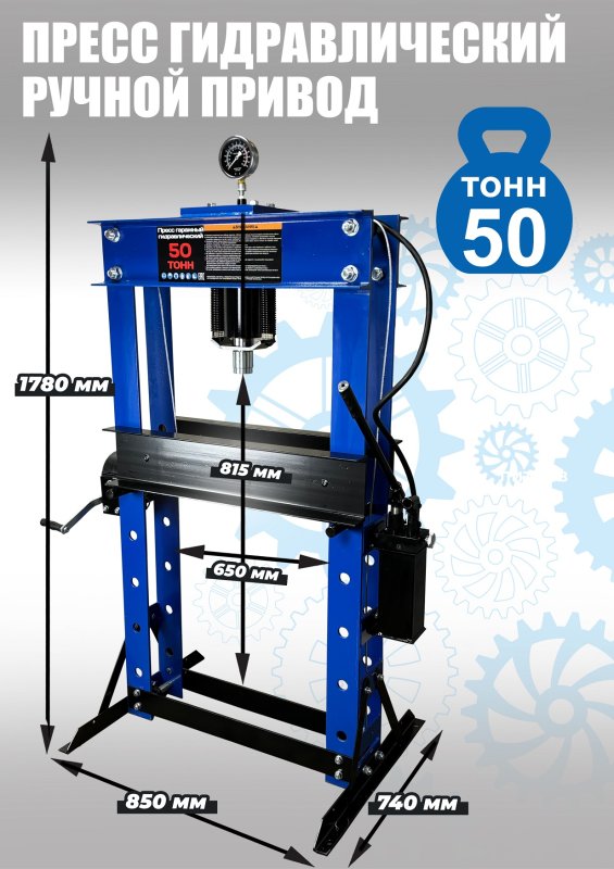 Пресс гидравлический, ручной усилие 50т. Две скорости подачи пуансона. Первая скорость для быстрой подачи штока к рабочей поверхности, вторая (медленно) для выпрессовки. Применяется для запрессовки деталей машин и механизмов в гаражах, автосервисах и СТО. Цвет синий.