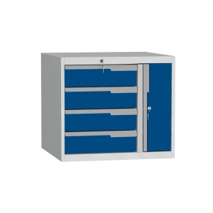 Модуль L-типа (680мм) серии CRAFT. С 4 выдвижными ящиками и выдвижным пеналом справа. Внутри пенала установлена перфорированная панель для навесного хранения и полка для хранения. Распределенная нагрузка на модуль - до 50 кг, (в том числе на пенал - 10кг.). Окраска RAL5001 и RAL7047 глянец.