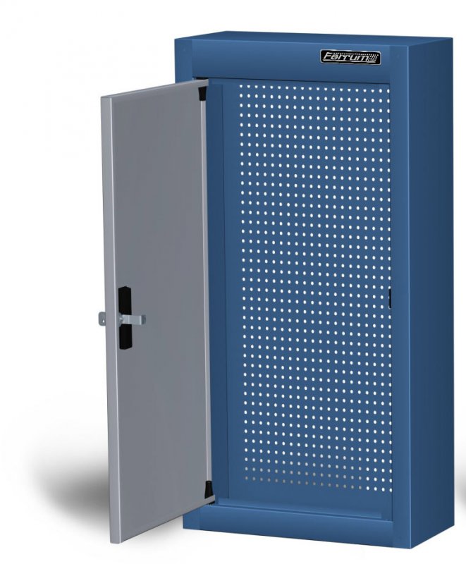 Шкаф инструментальный навесной Феррум Лайт 03.000L-5015/G Габариты: 438х200х730 см Имеет заднюю перфорированную стенку;  Устанавливается как с правым так и с левым открыванием дверцы;  Имеет удобную пластиковую ручку; оснащен замком Евролок;  Цвет двери серый; возможна комплектация шкафа крючками и держателями инструмента.
