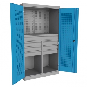 Шкаф инструментальный серии «PRF» предназначен для хранения оснастки, приспособлений и инструмента на рабочих местах в мастерских, цехах и других производственных зонах. Шкаф изготовлен из листовой стали и обеспечивает надежное запирание дверей ригельной системой. Шкаф данной модели может комплектоваться либо полками PRF(1) и ящиками PRF(1) – по всей ширине шкафа, при этом максимальное количество полок и ящиков по высоте - 13 штук. При установке перегородки, шкаф делится на две части и может комплектоваться полками PRF(2) и ящиками PRF(2), при этом максимальное количество полок и ящиков по высоте - 13 штук в два ряда. Нагрузка на ящики и планшеты PRF составляет не более 20 кг. Нагрузка на полку – не более 100 кг. Суммарная нагрузка на шкаф не более 400 кг. Шкаф оснащен замком «Евролок». Окраска элементов корпуса осуществляется порошковой полимерной краской: RAL 7037 (пыльно-серый), а дверцы RAL 5015 (небесно-синий) – складская программа, RAL 3003 (красный) – под заказ. Все шкафы отгружаются со склада в разобранном виде. Инструкцию по сборке вы можете скачать с нашего сайта.