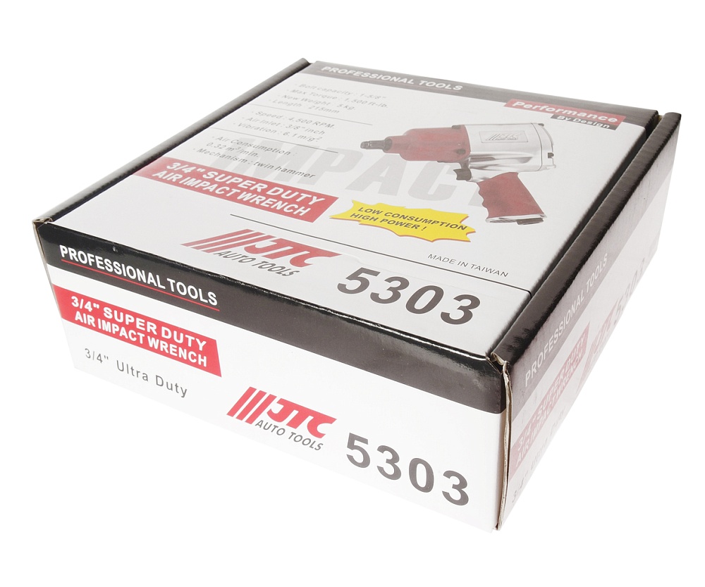 JTC-5303. Гайковерт 3/4". Ударный. Максимальное усилие пневмогайковерта - 2034 Нм, Посадочный размер под головку – 3/4”. Скорость вращения: 4500 об/мин. Размер воздушного штуцера: 3/8". Рабочее давление: 6-8 Атм. Вес: 5.1 кг. Гайковерт применяется в условиях слесарных мастерских, сборочных предприятий, строительных площадок. Механизм гайковерта – Twin Hammer (двойной ударный молоток).