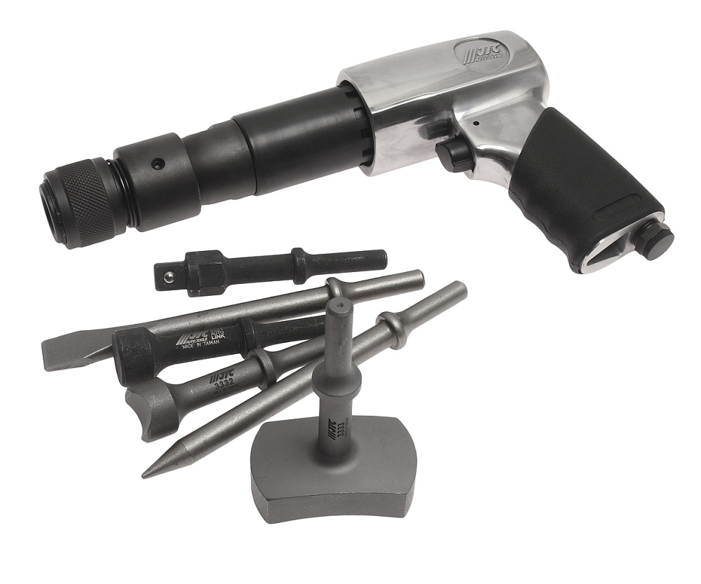 Пневмомолоток JTC с набором зубил JTC-3310K подойдет для демонтажа различных конструкций, а благодаря входящим в комплект зубилам, инструмент позволит выполнять работы по выдалбливанию отверстий, гнезд и пазов различного размера. Молоток обладает прочной конструкцией и удобной рукояткой. Изделие работает благодаря компрессору, который через шланг подает сжатый воздух в инструмент и приводит в действие ударный механизм.