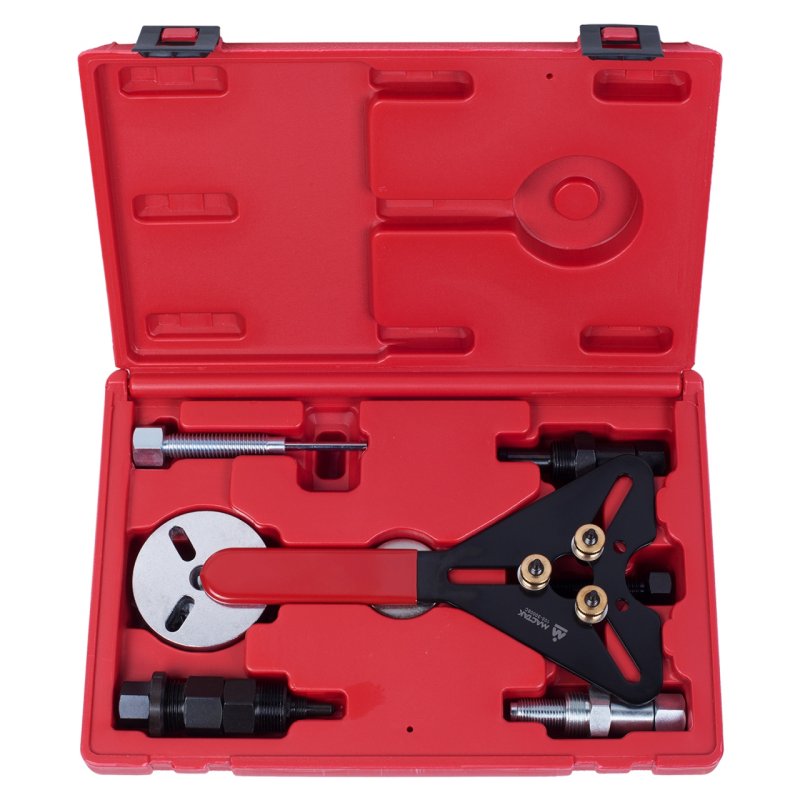 Набор для обслуживания компрессора кондиционера, кейс, 8 предметов МАСТАК 105-30008C предназначен для обслуживания компрессора кондиционера и фрикционных дисков при монтаже/демонтаже.